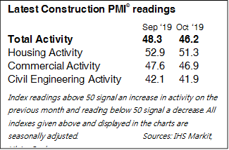 “The New Orders index fell from 50.8 in September to 48.8 in October, with a reading below the 50 no-change benchmark signalling that new orders decreased last month for the first time since June 2013.  Respondents linked this decline to Brexit uncertainty as anecdotes from the survey highlight that concerns about Brexit impacts continue to weigh on activity and sentiment regarding the sector’s prospects for the coming year.  In this context, the recent easing of concerns regarding Brexit crashout risk may offer some support for construction confidence and activity in the months ahead.”
