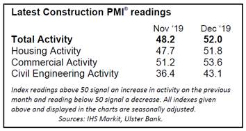 The Ulster Bank Construction Purchasing Managers’ Index (PMI) – a seasonally adjusted index designed to track changes in total construction activity – posted above the 50.0 no-change mark for the first time in four months during December. At 52.0, from 48.2 in November, the rise signalled a modest increase in construction activity.